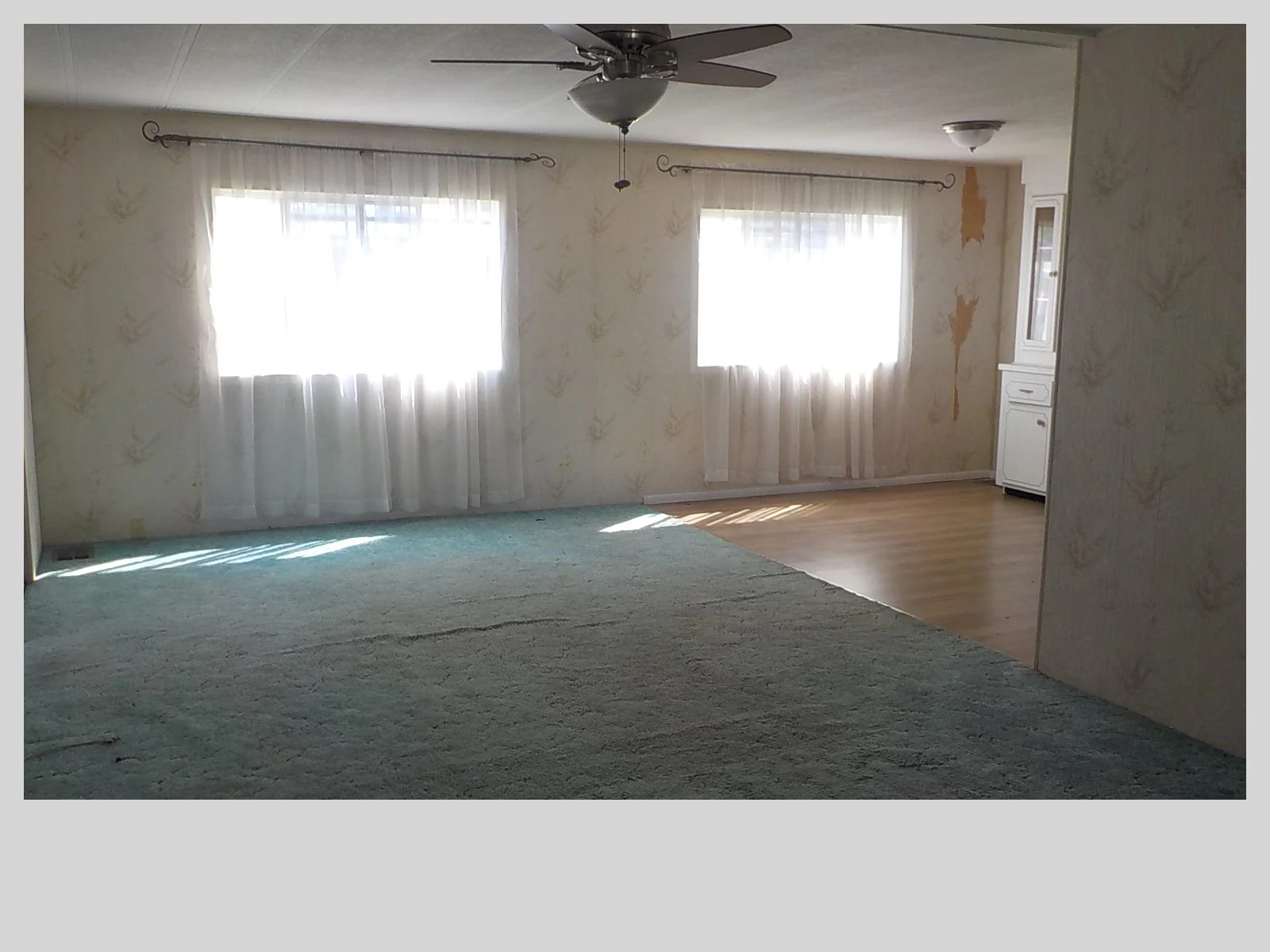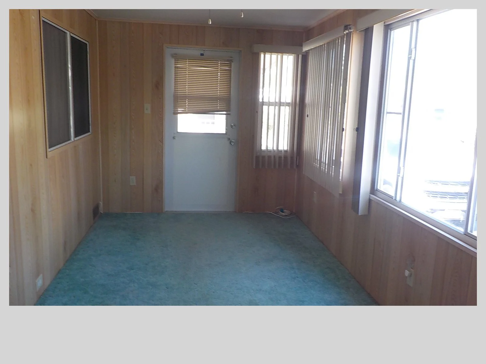 Oversized living room with two sliding glass doors leading to the front sitting area/lanai with newer windows.