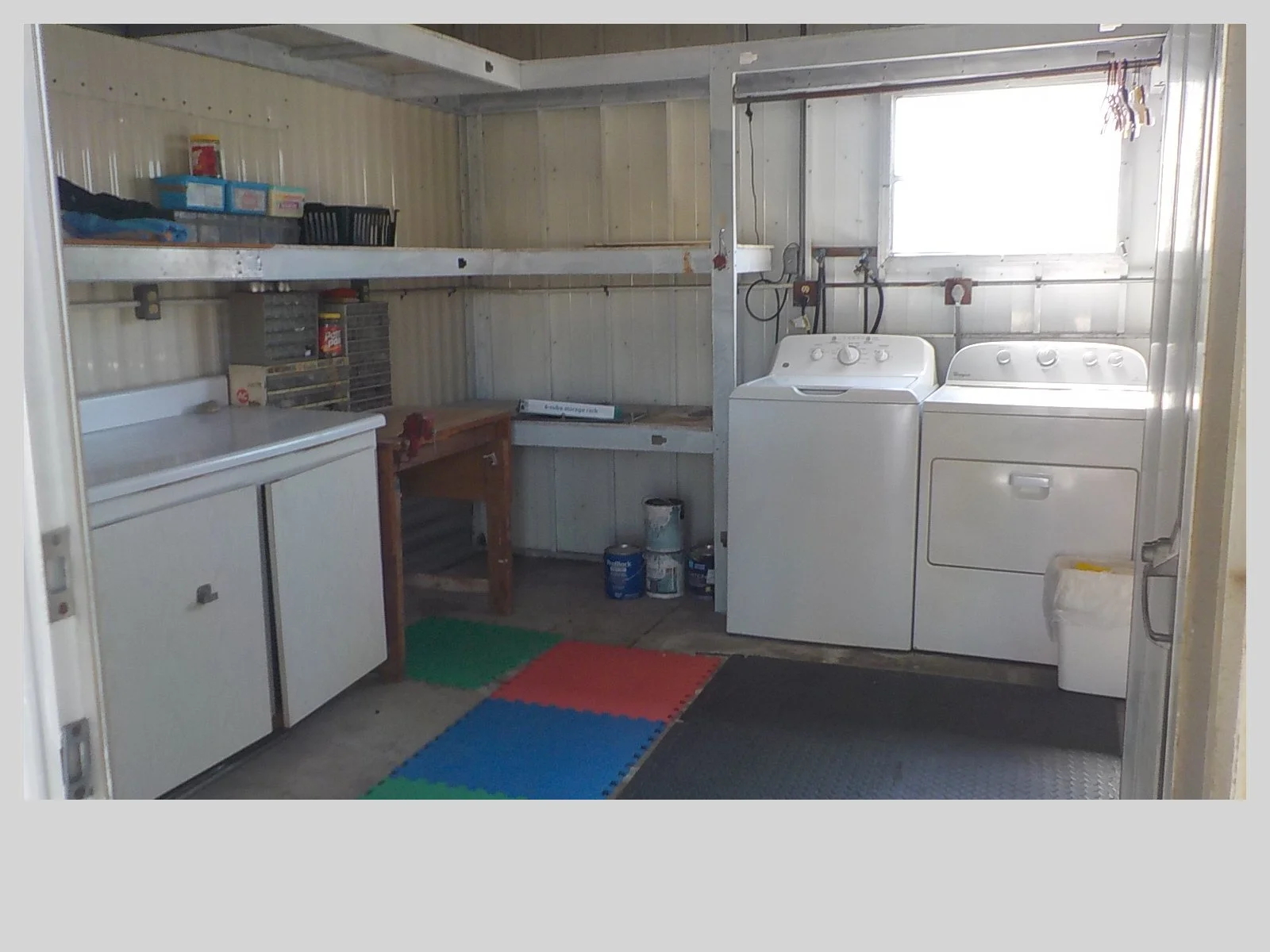Laundry room is over-sized with washer and dryer and tons of shelving.